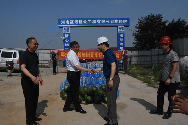 盛夏时节,高温炎热。6月22日上午,由集团公司党委和工会主办,市政工程建设管理中心、综合部、党群部承办的“送清凉、保健康、促和谐”慰问活动,走进市政工程建设施工现场,为烈日下辛勤工作的一线工人兄弟送去西瓜、水等防暑降温物资,送上集团公司的亲切关怀和问候。